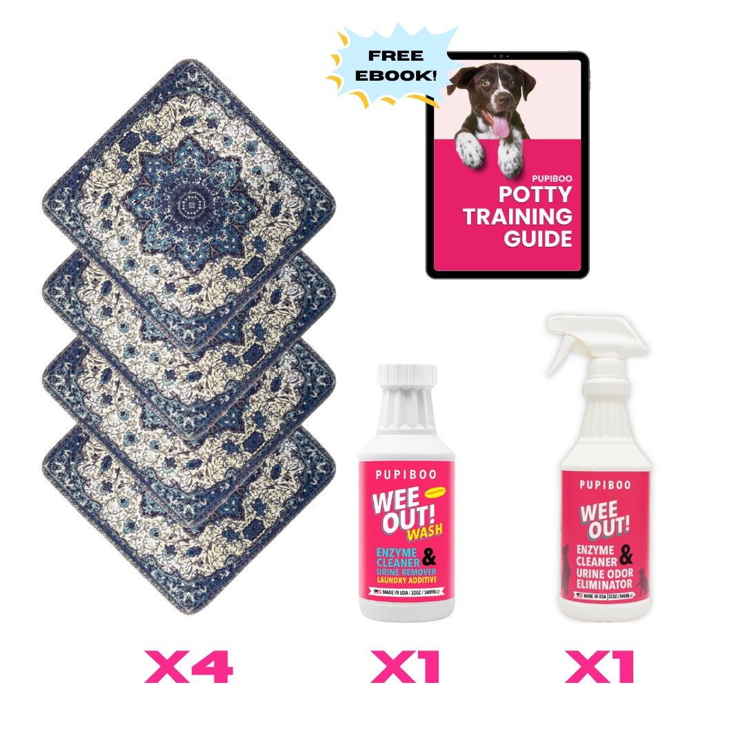 2 Packs of Pupiboo Washable Pee Pads (4 pads total): Our best-selling Persian-rug-style pads that blend seamlessly into your home while providing maximum absorbency and leak protection. Durable, washable, and eco-friendly.